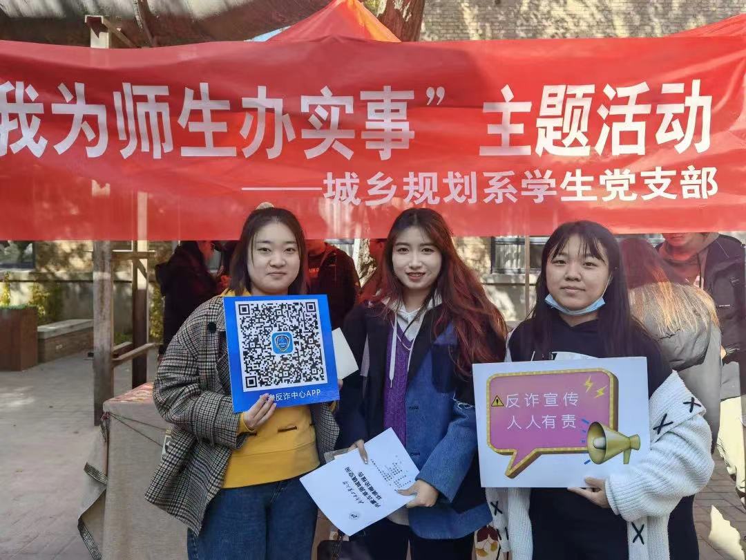 城乡规划系员工党支部将党史学习教育与员工教育管理相结合,将“我为师生办实事”成效转化为工作动力,以学促干,摸清师生最关心关注的问题,在推动反诈宣传进高校上下功夫、出实招,将“我为师生办实事”工作要求落到实处,提高了“办实事”的针对性和实效性。