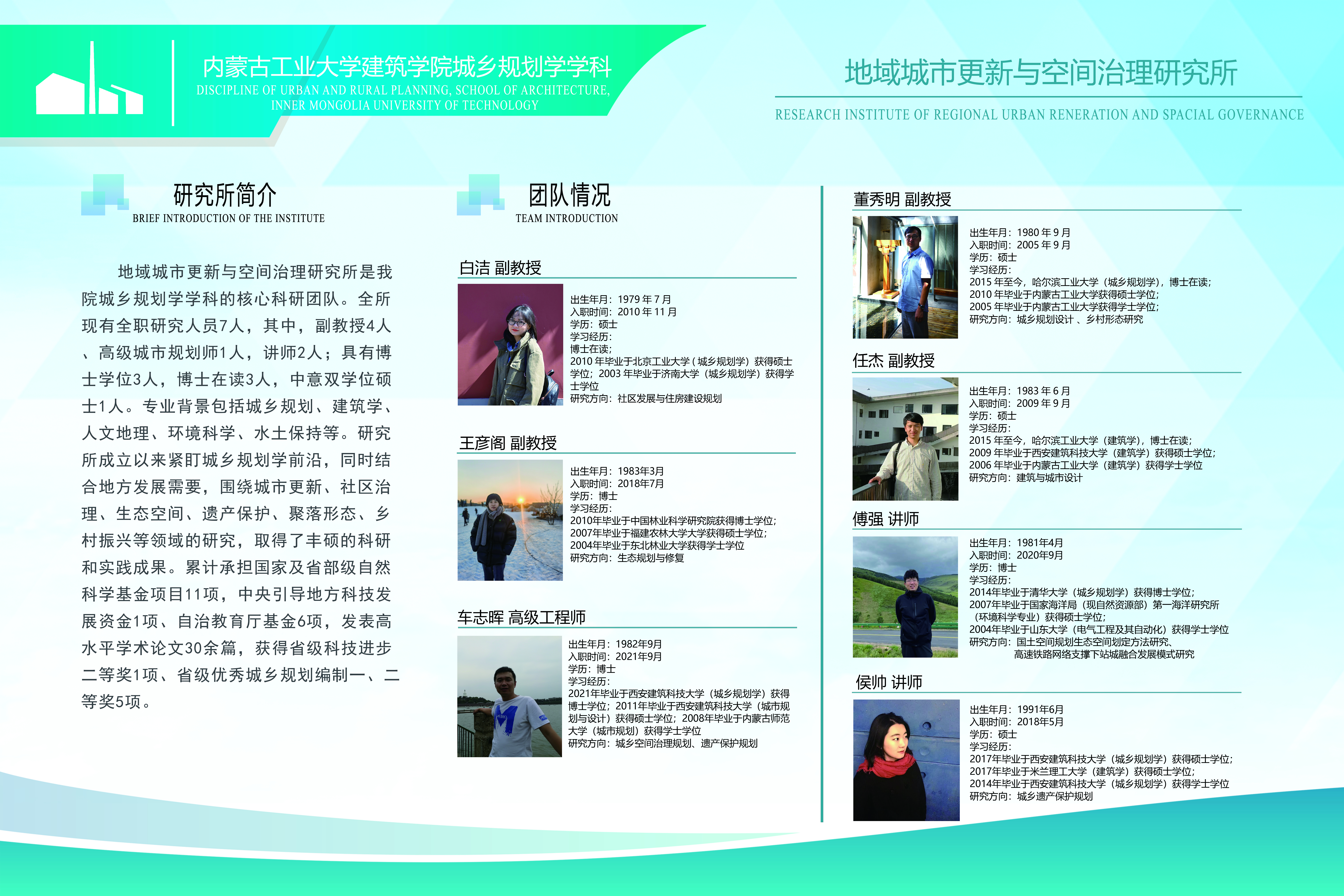 地域城市更新与空间治理研究所是公司城乡规划学学科的核心科研团队。全所现有全职研究人员7人,其中副教授4人、高级城市规划师1人,讲师2人;具有博士学位3人,博士在读3人,中意双学位硕士1人。专业背景包括城乡规划、建筑学、人文地理、环境科学、水土保持等。研究所成立以来紧盯城乡规划学前沿,同时结合地方发展需要,围绕城市更新、社区治理、生态空间、遗产保护、聚落形态、乡村振兴等领域的研究,取得了丰硕的科研和实践成果。累计承担国家及省部级自然科学基金项目11项,中央引导地方科技发展资金1项、自治教育厅基金6项,发表高水平学术论文30余篇,获得省级科技进步二等奖1项、省级优秀城乡规划编制一、二等奖5项。