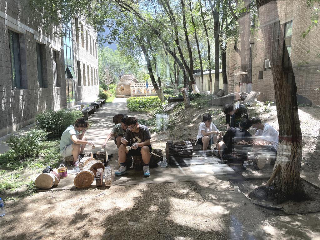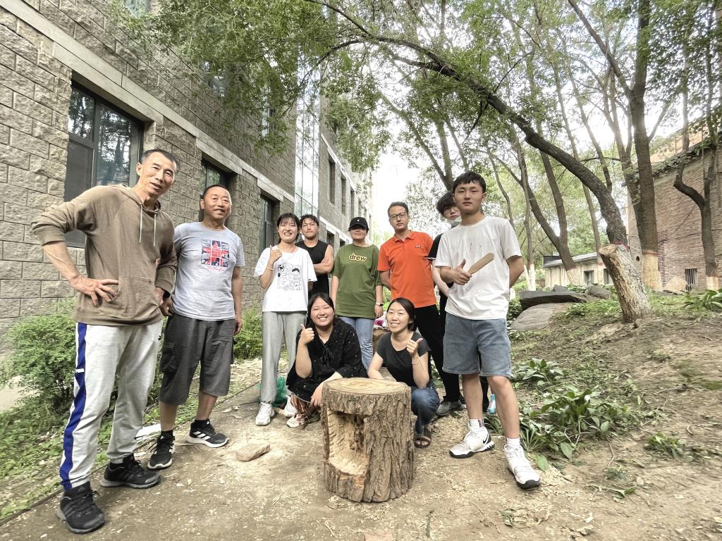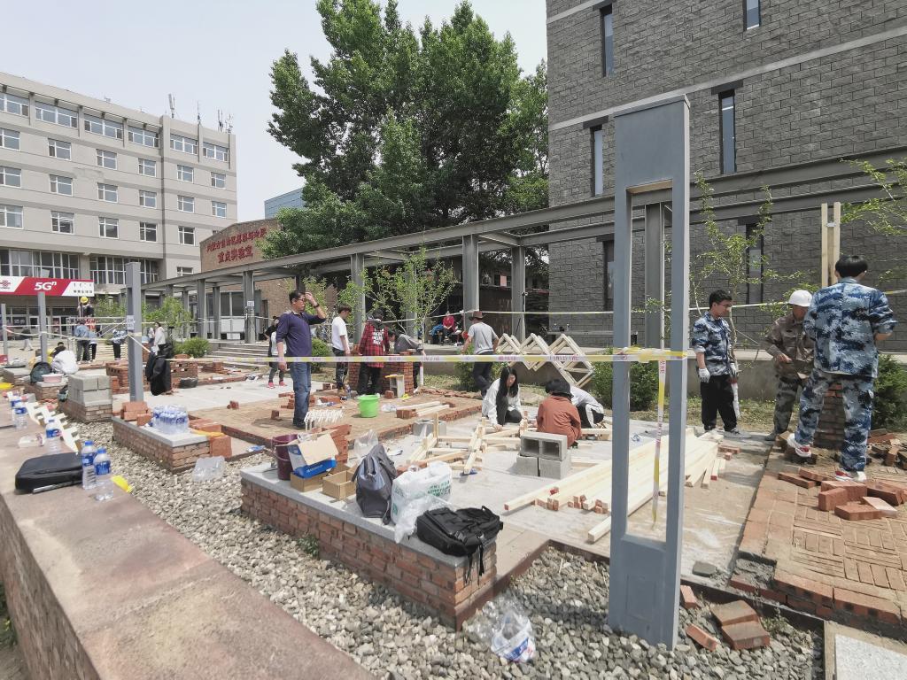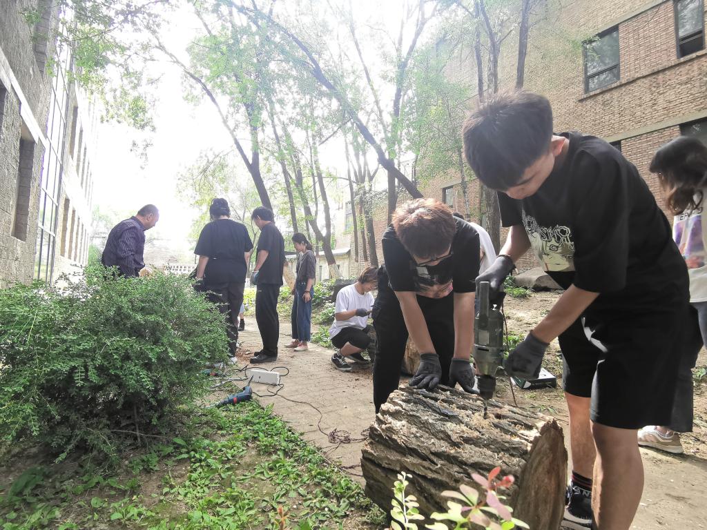 2021年5月6日,一场突如其来的沙尘暴吹倒了两棵校园行道树(图1),两棵倒木作为校园生态系统的重要组成部分一同见证了内工大数十年的成长与发展,对公司文化和校园碳库都有着重要意义。基于此,太阳成集团tyc122ccvip风景园林系的朋子老师向公司申请回收倒木并与2020级风景园林班员工志愿者一同启动了“拯救大树计划”,随即与风景园林系的戴捷老师一同组织开展了“校园生境营造”系列实践活动。本次活动以两棵倒木和建造节活动(图2)废料为原材料,以建筑馆“适应、更新、生长”的设计理念为灵感契机,确立了“自然、和谐、共生”的活动主题。期望通过景观营造的方式恢复建筑馆周边的自然生境,在美化校园的同时也能为公司内的“野生动植物”提供一处栖息地。