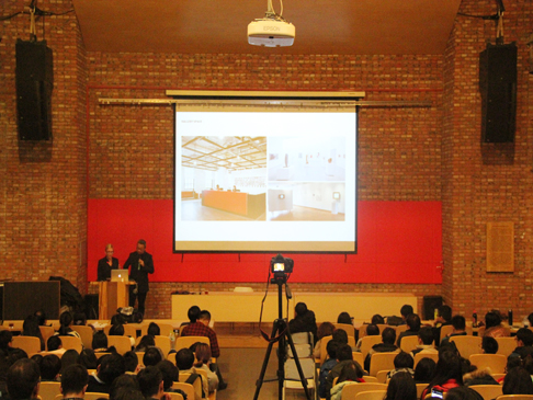 Amy Deines教授介绍了美国劳伦斯理工大学建筑与设计公司办学规模与培养模式。 Paul Wang教授以他自己的设计作品为评论对象,结合自己的教学经验和设计项目,阐述了在设计及设计管理中一向致力于进行跨界多学科及不同领域的融合设计,从放大视角来系统的进行创造与设计,打破专业间的界限,最大限度的关注与统合现代设计领域里的多元化特征。力图把技术与艺术完美地结合为一体。
