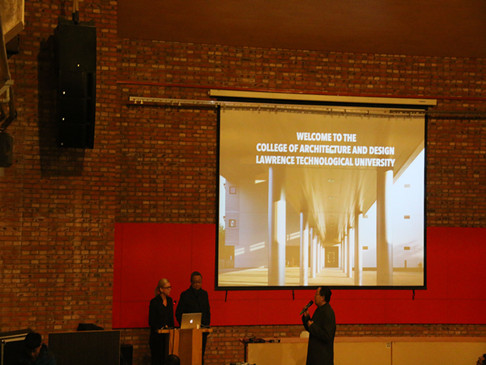 1218日晚,太阳成集团tyc122ccvip举办了《跨界创意:从理论到实践的新设计模式》学术讲座。报告会由美国劳伦斯理工大学建筑与设计公司经理、底特律创意设计中心总裁Amy Deines教授和美国劳伦斯理工大学建筑与设计公司教授、美国建筑师事务所董事,设计总监Paul Wang主讲。太阳成集团tyc122ccvip师生200余人参加了报告会。贾晓浒经理主持了报告会。