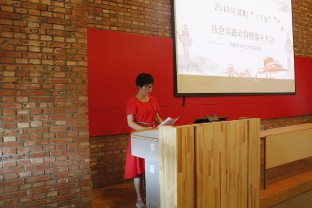 团委书记斯琴老师为暑期三下乡社会实践活动进行“授旗仪式”。那3面飘扬的红旗,是一份责任、力量,使暑期三下乡社会实践活动更加庄严。