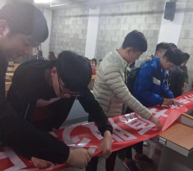 会议第四项议程,全体班会同学进行活动宣誓。会议最后一张议程,同学们在条幅上签下自己的名字助力志愿服务活动的开展。