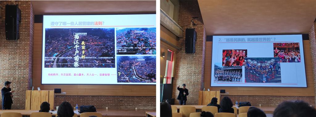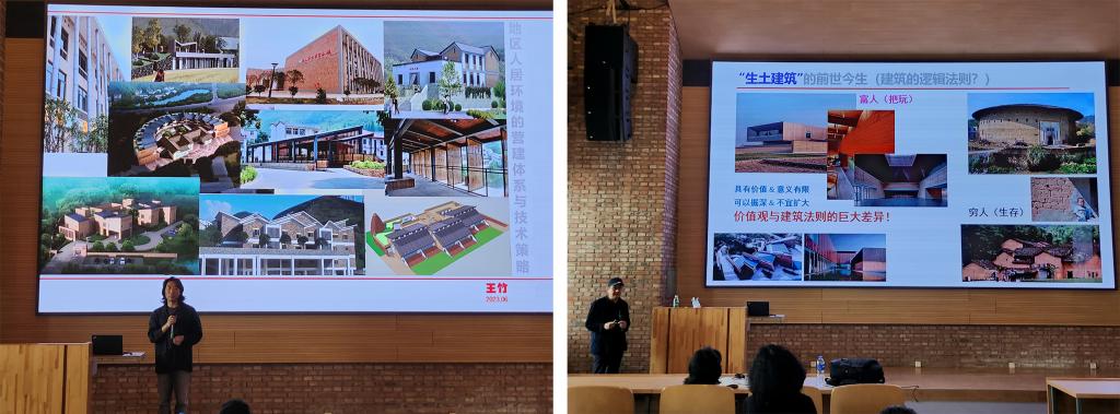 下午2点30分,王竹教授分享了他的研究内容。在开始之前,他提出了一系列问题引发思考,包括:生土建筑的历史与现状,建筑的逻辑法则是什么?传统聚落遵守了哪些人居营建法则?早期的开平碉楼与现代罗马柱式小洋楼的对比,以及绍兴水肌型网络居聚与徽州坡坑式聚落的对比,还有百年古村与现代新村的对比,古法井盐开采与临安杨梅大棚的对比。王教授提到了都江堰一直不需要保护和传承的问题,以及关注地区建筑营建的混沌状态。讲座主要探讨了“传统活化”的意识和法则应对新的千篇一律的挑战。