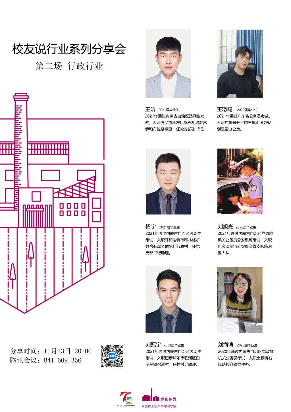 此次邀请到了2020届和2021届通过公务员、选调生考试的六位优秀员工进行分享。2020届员工王辙鸥通过一个小故事分享了为人民服务的职业理想和备考初心,以及公务员考试的注意事项,提醒同学们注意把握应届报考的机会。2020届员工刘旭光介绍了个人考公经历,他面试翻盘的案例和充满正义感的职业价值观使同学们备受鼓舞。2020届员工刘海涛从公考经历、选岗注意和个人感受三个方面,给予了同学们中肯的建议。随后,2021届三位考取内蒙古自治区选调生的员工进行了分享。杨宇、刘冠宇和王昕从不同角度对比了选调生和公务员考试的异同,详细说明了选调生笔试备考的流程,强调了考试中抢分意识的重要性,并分享了目前岗位的工作情况。