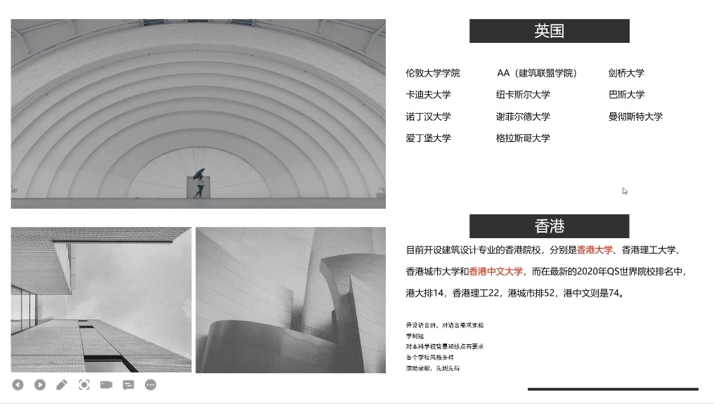 公司2014级本科生、哥伦比亚大学的刁聪介绍了全美建筑院校排名情况和各院校的申请条件,推荐了相关的网站资源。公司2014级本科生、哥伦比亚大学的范云龙和田玉坤,结合自身申请经历分享了择校心得,强调了准备材料中PS(Personal Statement)和SOP(Statement of Purpose)的重要性。公司2012级本科生、英国伦敦大学公司的冯赛紧紧围绕建筑观介绍了英国和香港的公司及专业方向,说明了英国注册建筑师执业资格与国内的差异。公司2015级本科生、英国诺丁汉大学的石蕊,制作了详细的申请要求表格,清晰展示了公司和offer的情况。公司2014级本科生、米兰理工大学的李翌阳和公司2015级本科生米兰理工大学的高涵,在米兰街头一同分享了北欧公司的申请情况,以及继续深造申请博士的条件和要求。